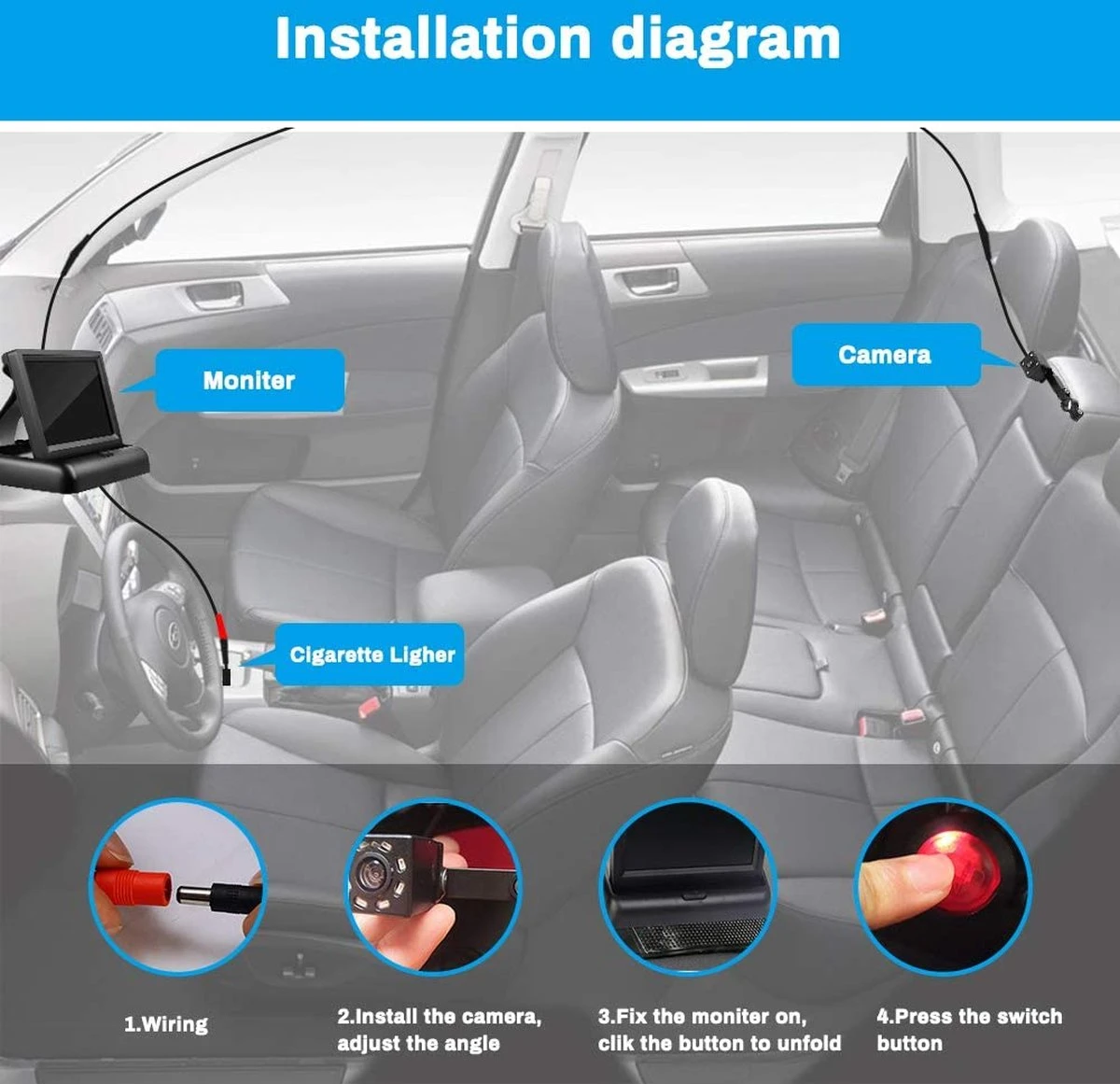 Geen montage nodig. De set kan in enkele seconden worden geïnstalleerd. Op de bijgeleverde gebruiksaanwijzing staan de stappen uitgelegd. Installeer de camera op de hoofdsteun, bevestig het scherm op het dashboard van uw voertuig en sluit het op de sigarettenaansteker aan. De babycamera schakelt zichzelf dan automatisch in.