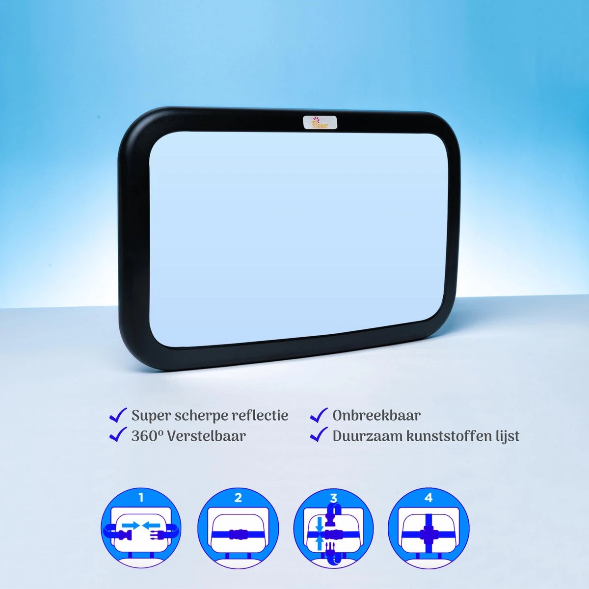 Iedere ouder houdt dag in dag uit hun baby goed in de gaten. Een omgekeerd baby stoeltje in de auto maakt dit echter behoorlijk lastig. Onze “Achterbank Spiegel met Baby on Board Sticker” helpt dat veilige gevoel weer terug te krijgen. Niet meer onnodig de auto uit nadat je een onbekend geluid hoorde vanaf de achterbank. Met deze baby autospiegel kun je met 1 blik je kindje zien en met een gerust hart door blijven rijden. Daarnaast zal de “Baby on Board Sticker” het gedrag van andere bestuurders positief beinvloeden, wat zal leiden tot nog veiligere verkeerssituaties.
