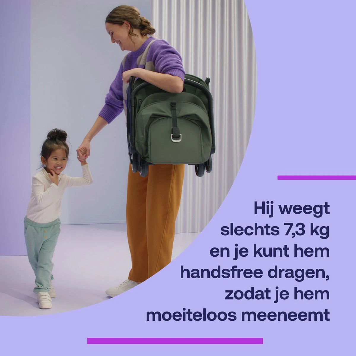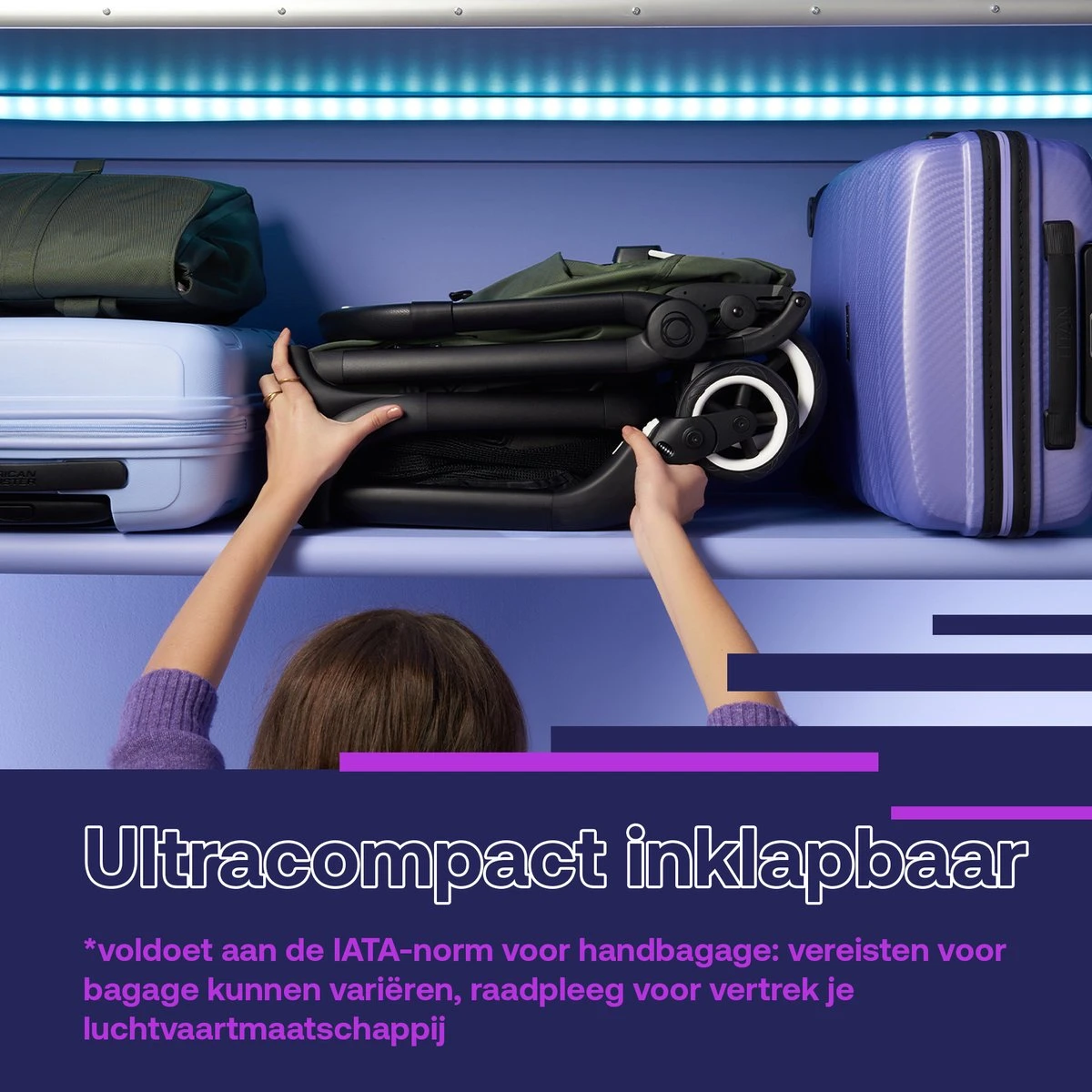De Bugaboo Butterfly Kinderwagen is lichtgewicht, compact en makkelijk om mee te nemen. Het inklappen van de wagen is met een seconde gebeurt. Hiervoor heb je maar één hand nodig en hoef je maar één knop in te drukken, zo simpel kan het zijn. Dankzij het ultra compacte formaat is de kinderwagen geschikt voor in het bagagevak boven je hoofd, in de auto of een smalle gang. Eenmaal opgevouwen kun je de kinderwagen meedragen aan beensteun, duwbeugel of draagband.