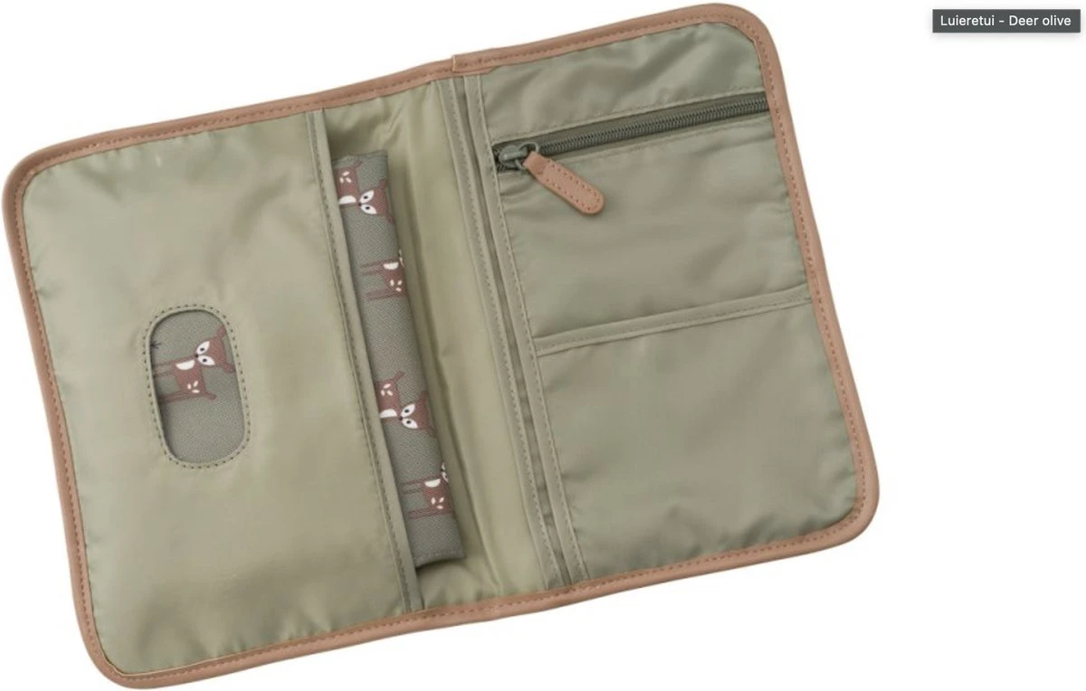 Luieretui Deer Olive van Fresk heeft een handig waterafstotend verschoningsmatje voor onderweg en heeft handig opbergvakjes voor babydoekjes en andere kleine spulletjes. Het luiertasje kan je met een elastische bandje vastmaken.