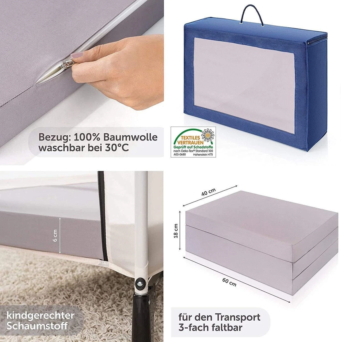 - Met extra reismatras: Opvouwbaar matras van Alvi, 120x60x6 cm groot, met zijn eigen draagtas in de set inbegrepen.
