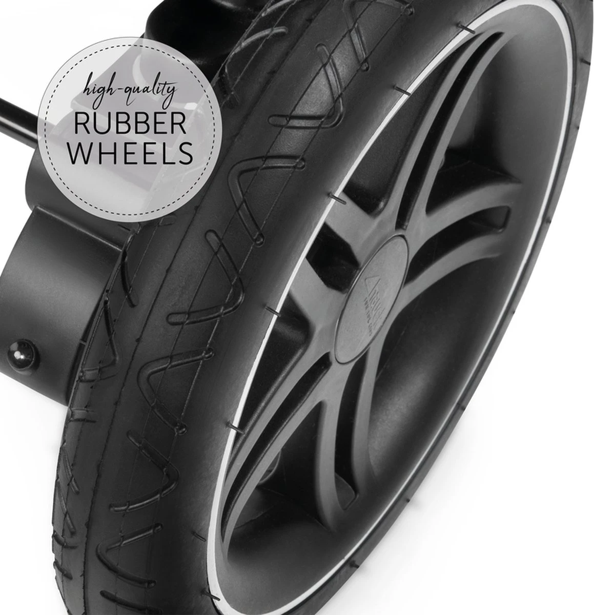 Technische details: Afmetingen (lengte x breedte x hoogte): 94 x 77,5 x 103 cm Inklapbare afmetingen (lengte x breedte x hoogte): 84 x 77,5 x 36 cm Gewicht: 17,45 kg Belastbaar tot max. 36 kg Diameter voorwiel/achterwiel: 18/27 cm Type banden: rubber wiel Verstelling van de rugleuning: 117 tot 159°. Inbegrepen in de levering: Kinderwagen Bekerhouder Opbergmand Adapter set x2
