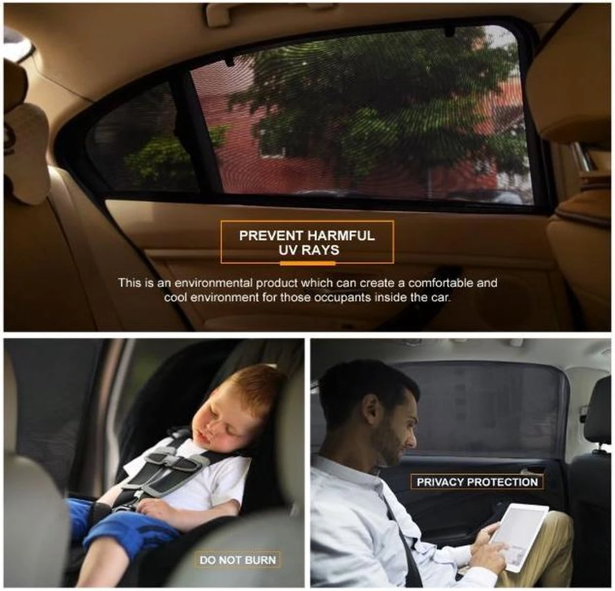 SPF 30 + gelijkwaardige bescherming – Bescherm uw gezin in hun autostoel, zonnekleppen passen zich aan de zijruiten van de auto aan. Dit vermindert de schittering van de zon, vermindert de hitte en voorkomt dat de huid van uw kinderen en dieren verbrandt.