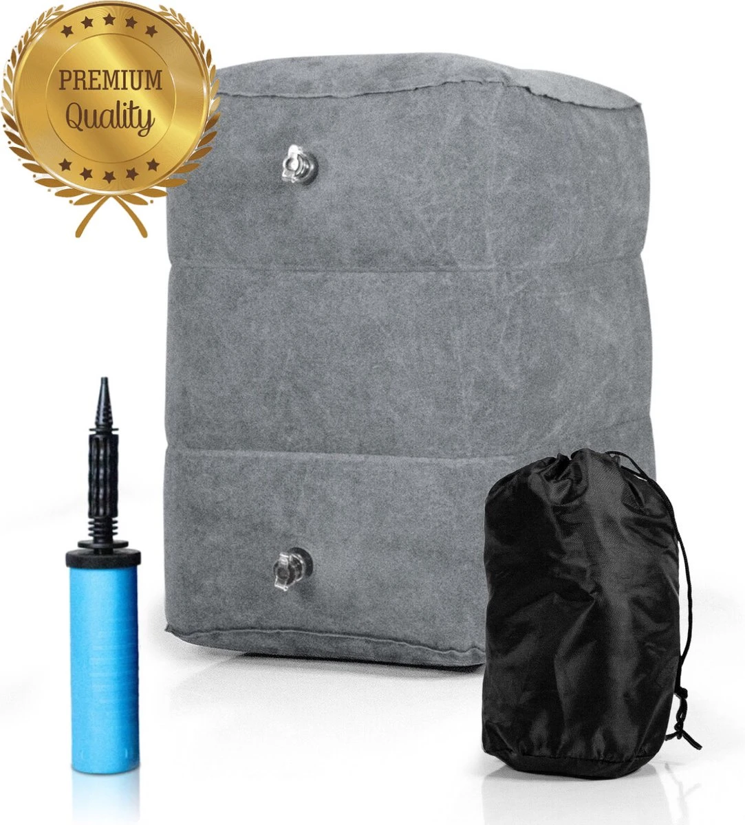 Merkloos Voetensteun – Vliegtuigbedje – Premium Quality – Reisbedje – 3 Hoogtestanden – Vliegtuig Kussen – Voetenbankje Of Poef – Met Opbergzakje & Pomp – Grijs