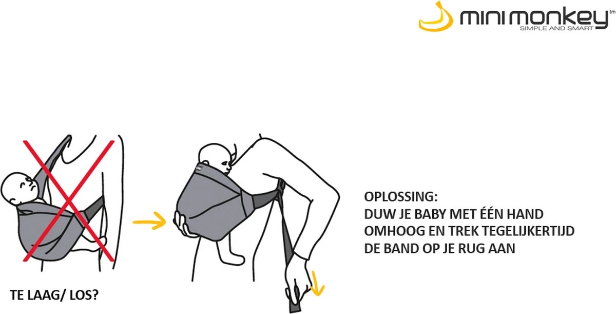 Hij draagt verrassend fijn en hij is ook nog eens super makkelijk en snel. Na wat oefening heb je je baby er in minder dan 30 seconde in. Om frustratie te voorkomen adviseren wij met klem om de INSTRUCTIE VIDEO en de TIPS op de MINIMONKEY WEBSITE goed te bekijken en op te volgen. Vooral de eerste tip op onze website, ‘zorg voor voldoende steun‘, is erg nuttig. Als je de drager goed gebruikt – het schouderstuk over je schouder en bovenarm spreidt en de bovenrand van de sling aan beide kanten op okselhoogte draagt – krijgt de baby voldoende steun en zal hij ook voor jezelf prettig dragen.